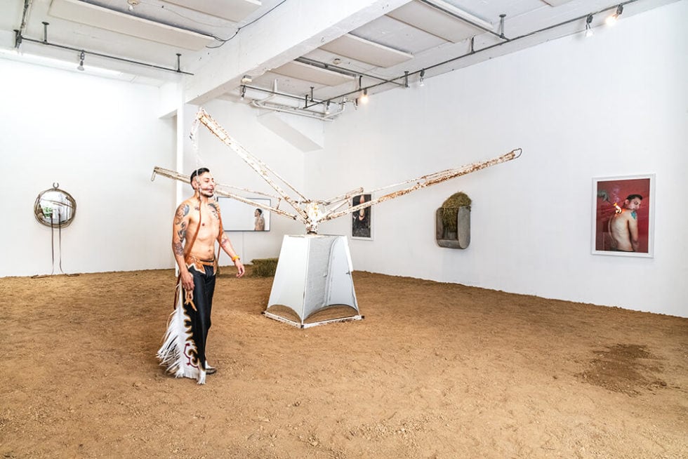 José Villalobos’ multimedia practice conveys the effects of machismo within Norteño culture. Through sculpture and performance Villalobos’ displays a nuanced and proud connection to his heritage, withstanding the historic and violent undercurrents of homophobia that exist within it. Villalobos grew up in a traditional and religiously conservative family on the US/Mexico border in El Paso, TX. His work reconciles identity challenges he faced throughout his life, caught in between traditional Mexican customs and American mores, as well as religious ideologies condemning gayness. At the heart of Villalobos’s work lies in the performativity of these identities. Sometimes by performing self-inflicted endurance acts, he makes visible the unseen trauma endured by those who exist beyond artificially constructed “norms.” Villalobos manipulates material as he examines gender roles within family and culture. Dismantling historical modes of masculinity centers an interstitial space where materiality softens virility. Villalobos’ practice protests the toxicity of assimilation and reclaims the maricón label. As LGBTQ+ and body autonomy rights are increasingly at risk, and the government fails to provide protection for basic human rights, Villalobos’ commentary is crucial to shedding light on the silencing of queer voices.
